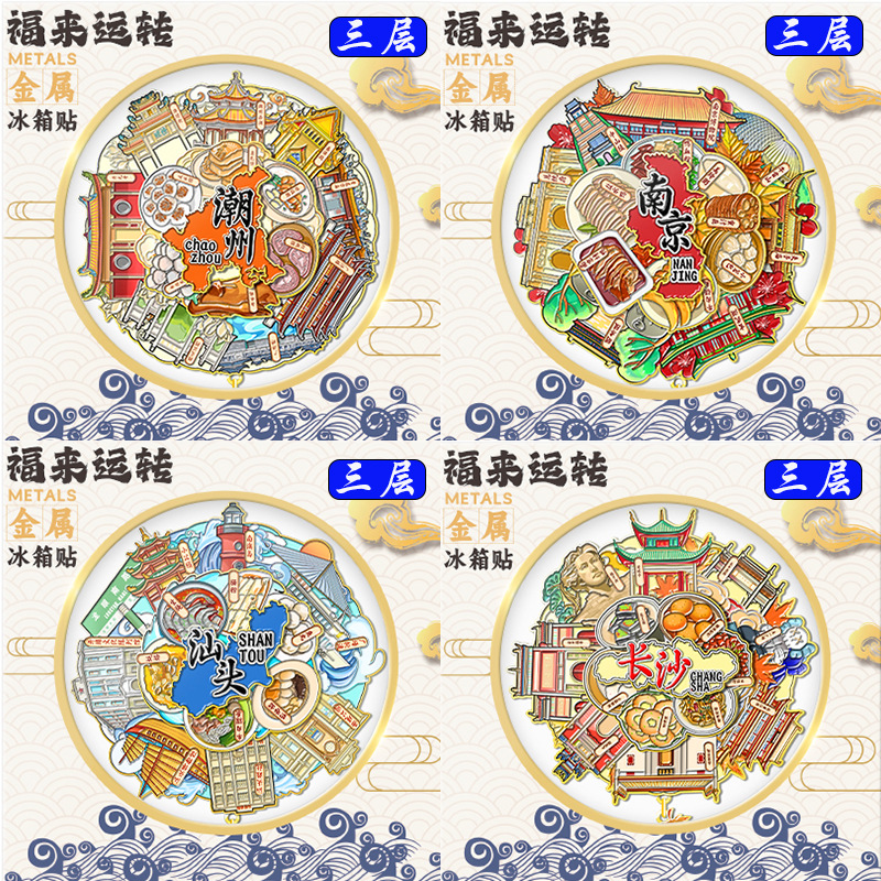 High-End Three-Layer Rotating Disc Gift Box Metal Refrigerator Magnet Collection with Pendant Play City Set Magnetic Sticker