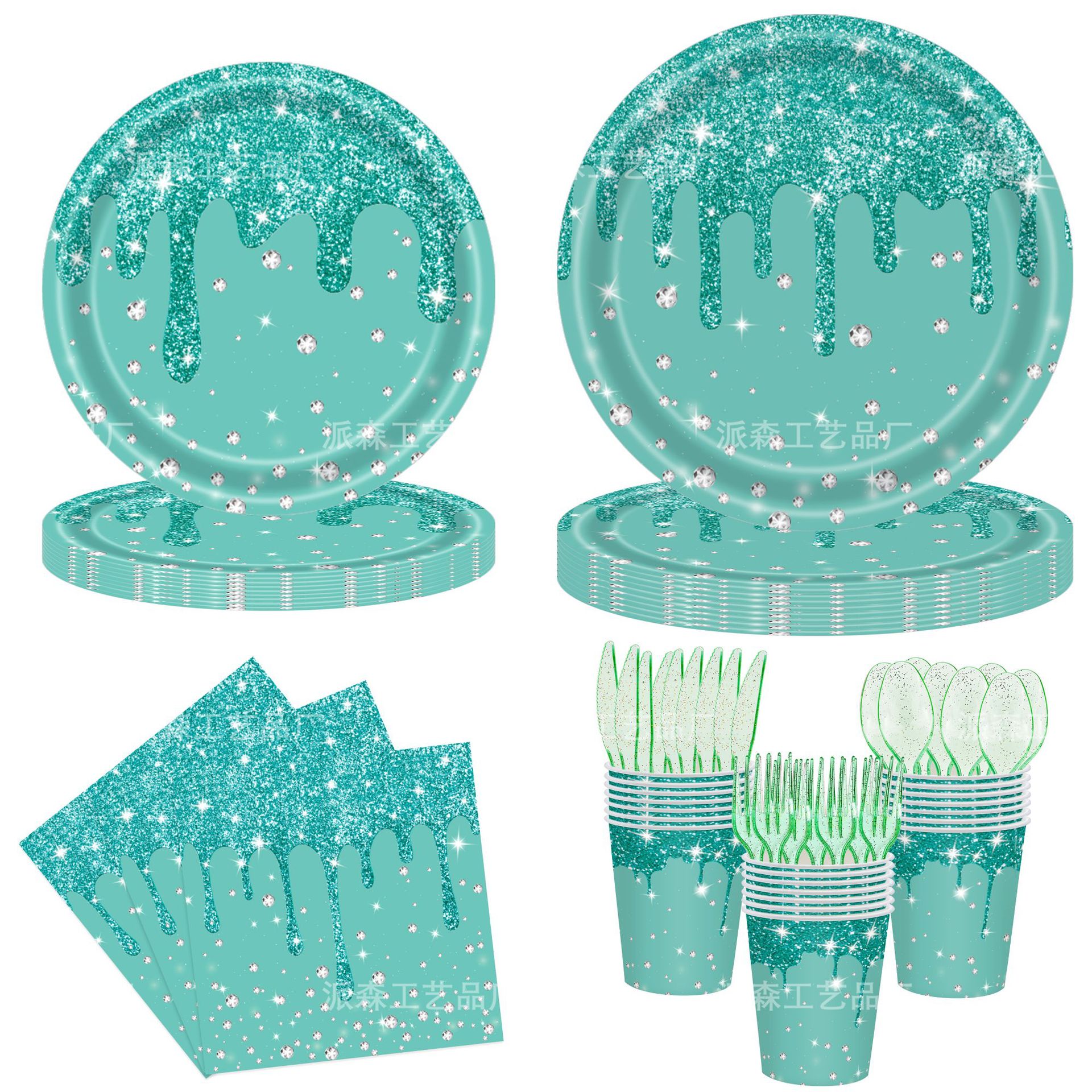 New Diamond Gilt Turquoise Birthday Party Tableware Supplies Disposable Round Paper Plate Paper Cup Paper Towel Fork Set