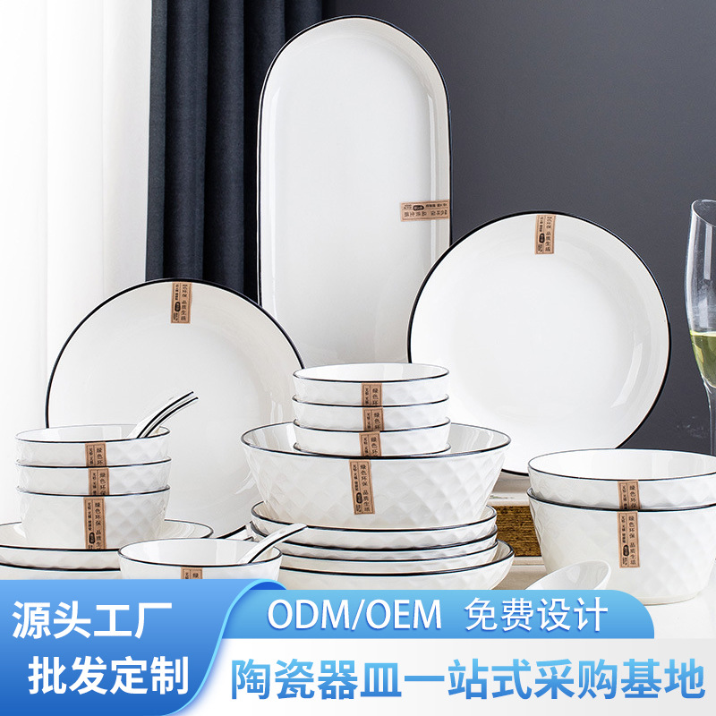 Wholesale ceramic new black line 2-10 people rice bowl saucer suit minimalist diamond light luxury tableware dish plate large soup bowl