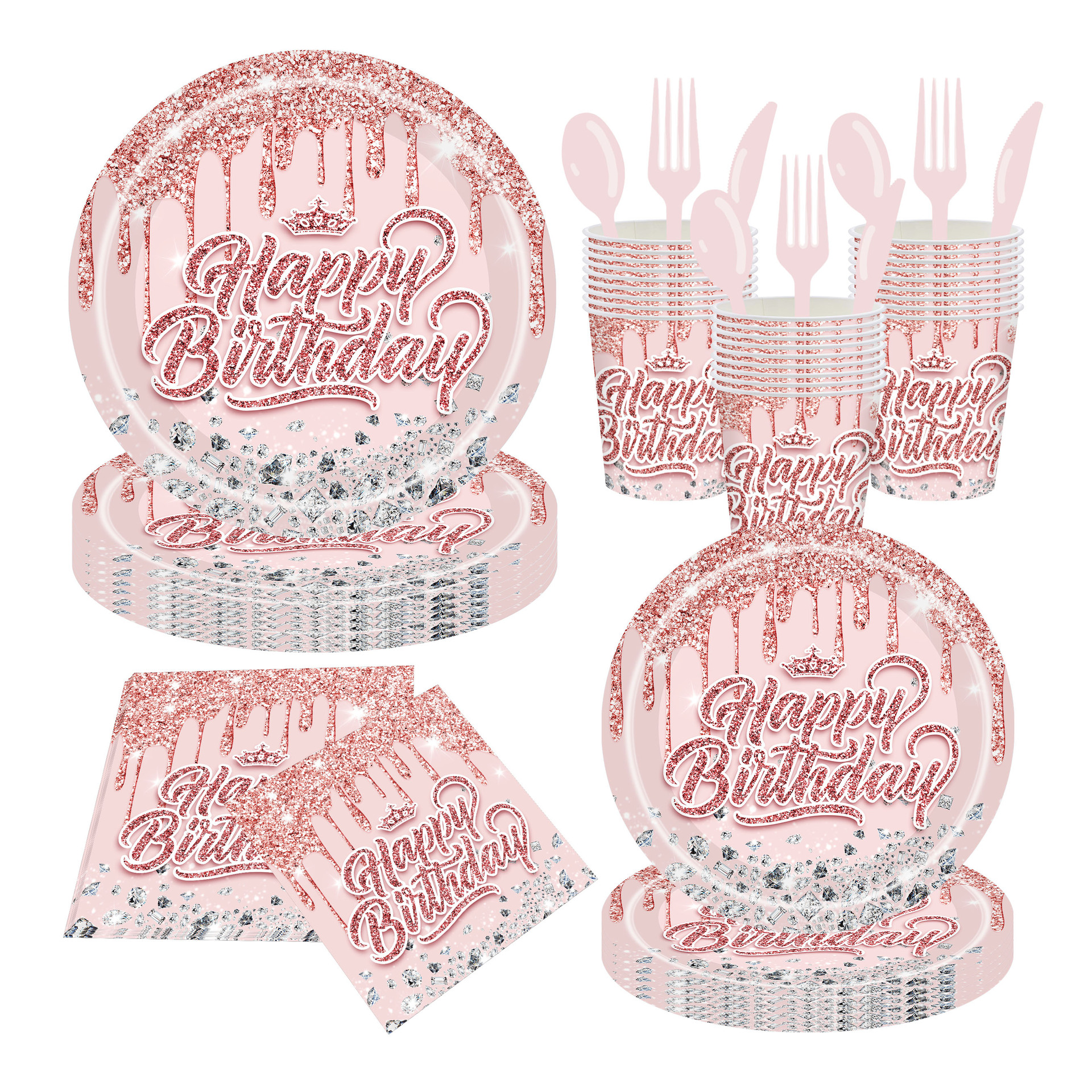 Cross-Border Diamond Birthday Theme Party Supplies Pink Decorative Paper Cups Paper Towels Paper Plates Tableware Set Venue Layout