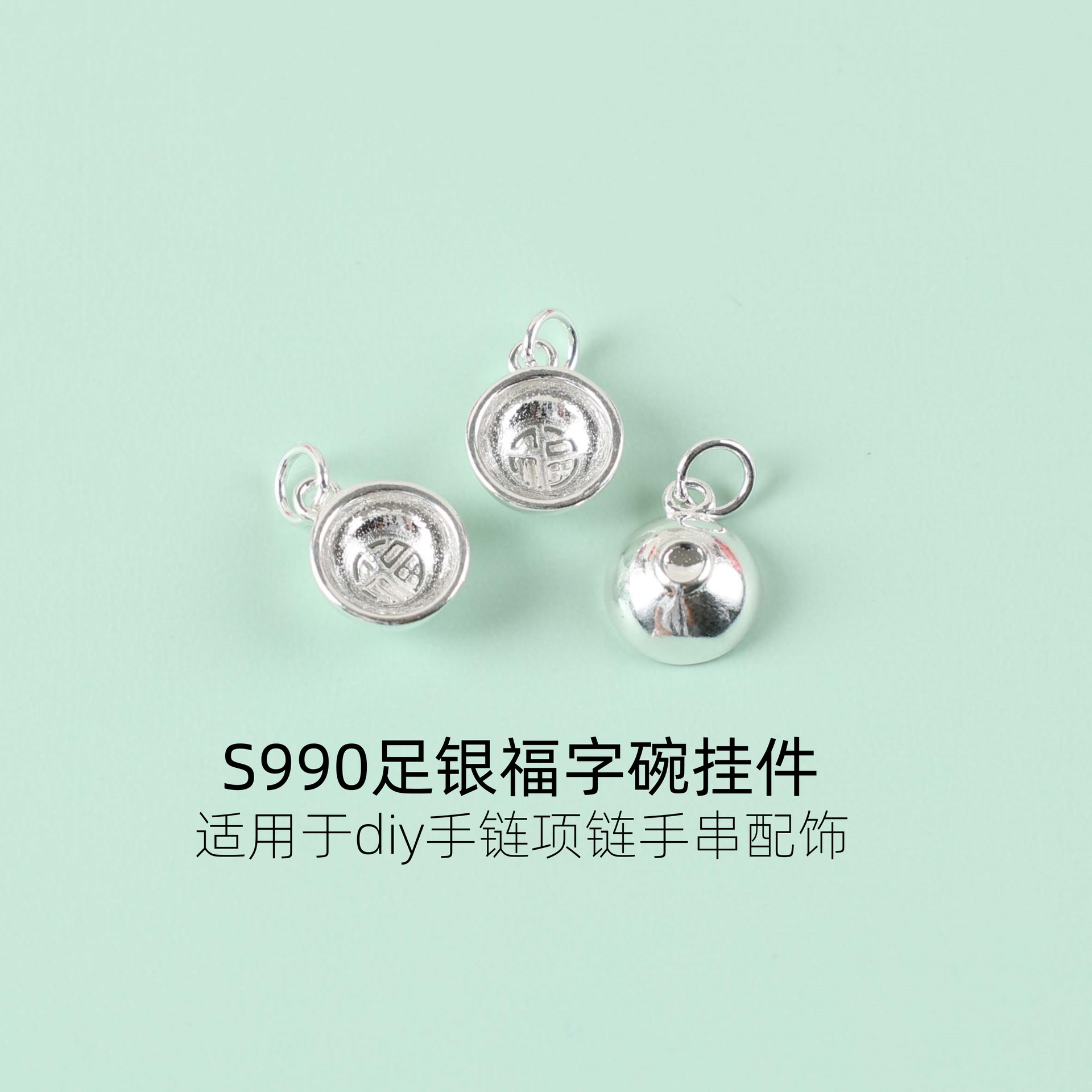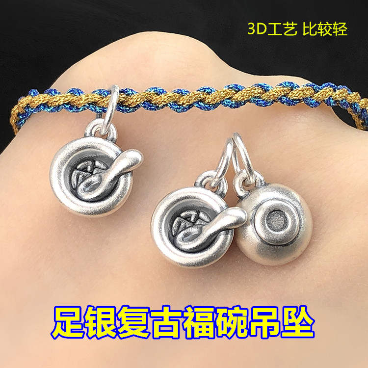 S999 Foot Silver Vintage Small Fu Bowl Spoon Pendant Hanging Ornaments Woven Bracelet String Bracelet Necklace Handmade DIY Accessories