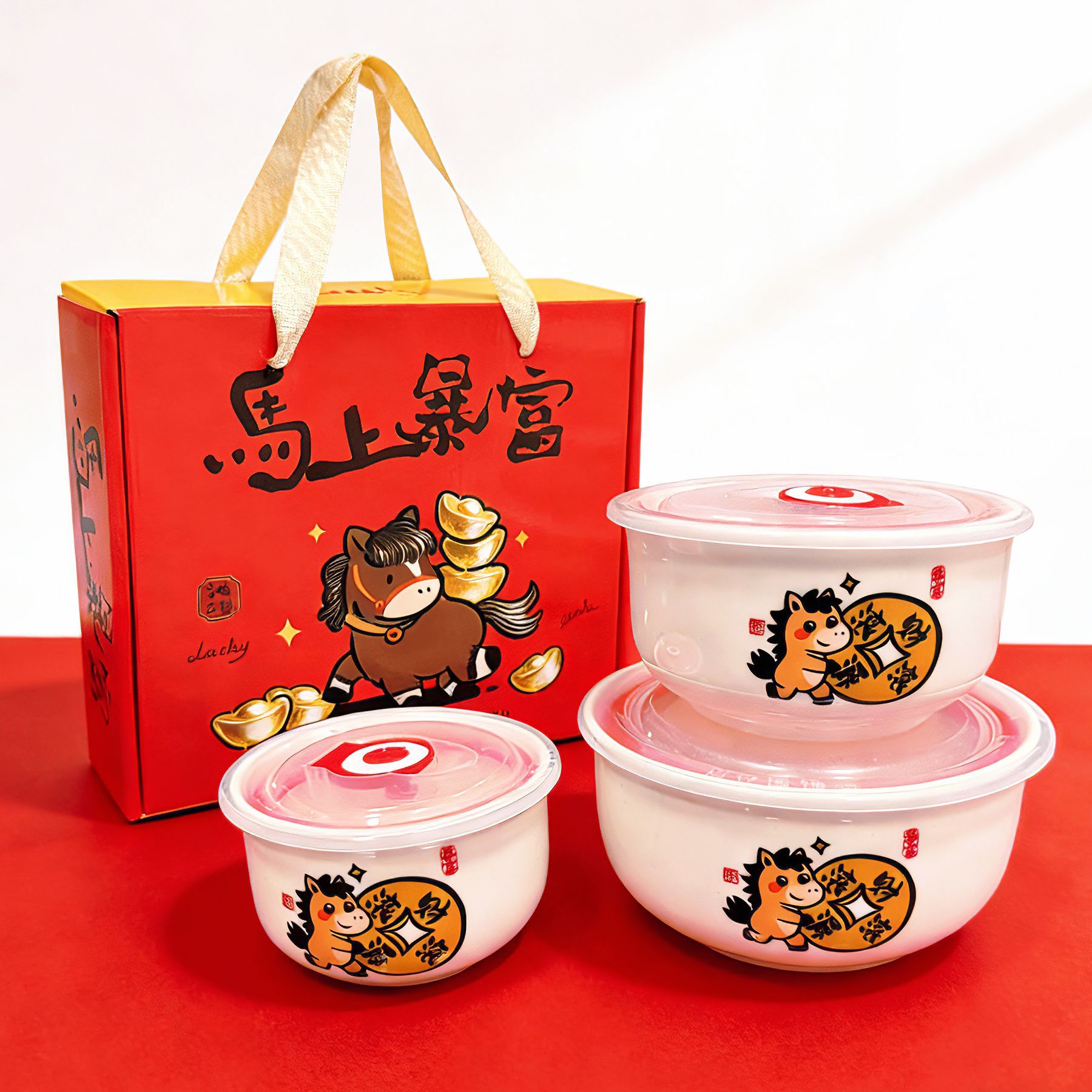Ceramic Microwave Bowl Three-Piece Set Sealed Bowl Jewelry Opening Event Gift Set Year of the Horse Promotional Gift Wholesale