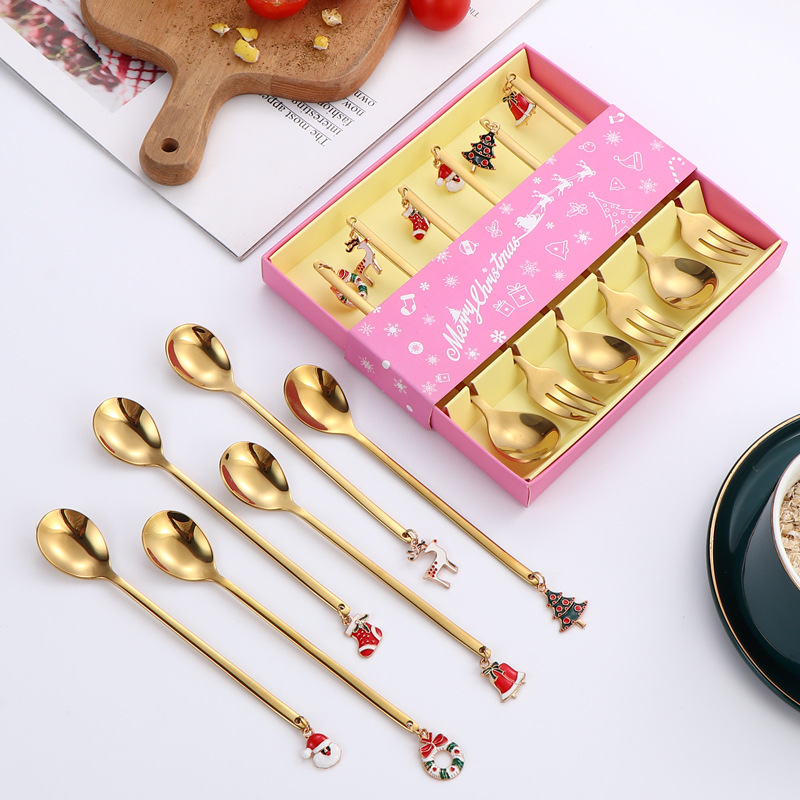 Cross Border Products Stainless Steel Tableware Christmas Gift Spoon Fork suit Dessert Spoon Coffee Stir Christmas Pendant Spoon