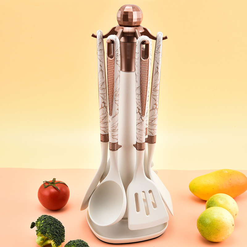 Seven-Piece Silicone Kitchenware Set with Diamond Pattern Handle, Non-Stick Pan, Special Spatula, Soup Spoon, Frying Spatula, Powder Scoop, Colander, Salad