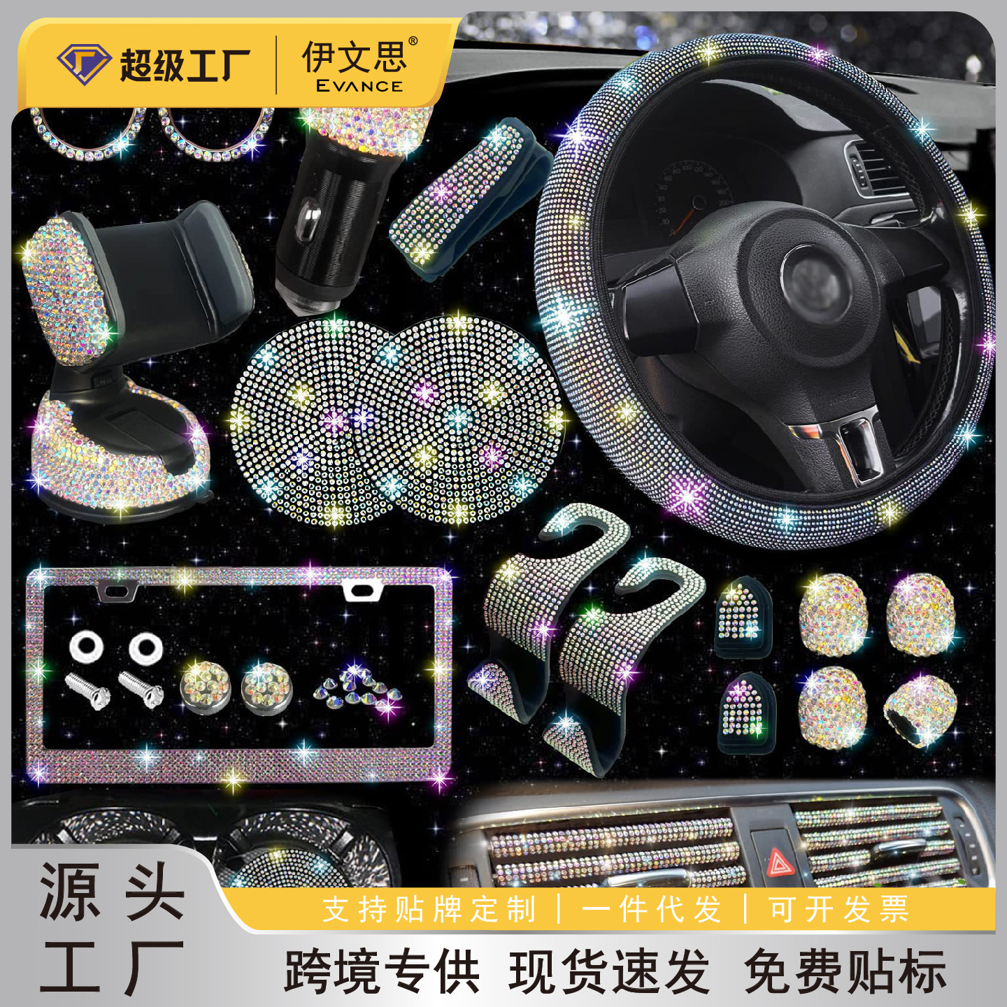 Car Steering Wheel Cover for All Seasons, Anti-Slip Diamond Combination, Multi-Piece Set, Mobile Phone Holder, Steering Wheel Protective Cover