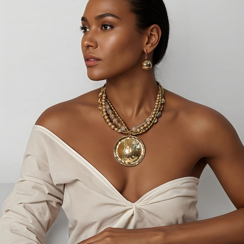 European and American Retro Exaggerated Multi-Layered Pearl Gold Necklace Earrings Set Bohemian Large Disc Pendant Necklace
