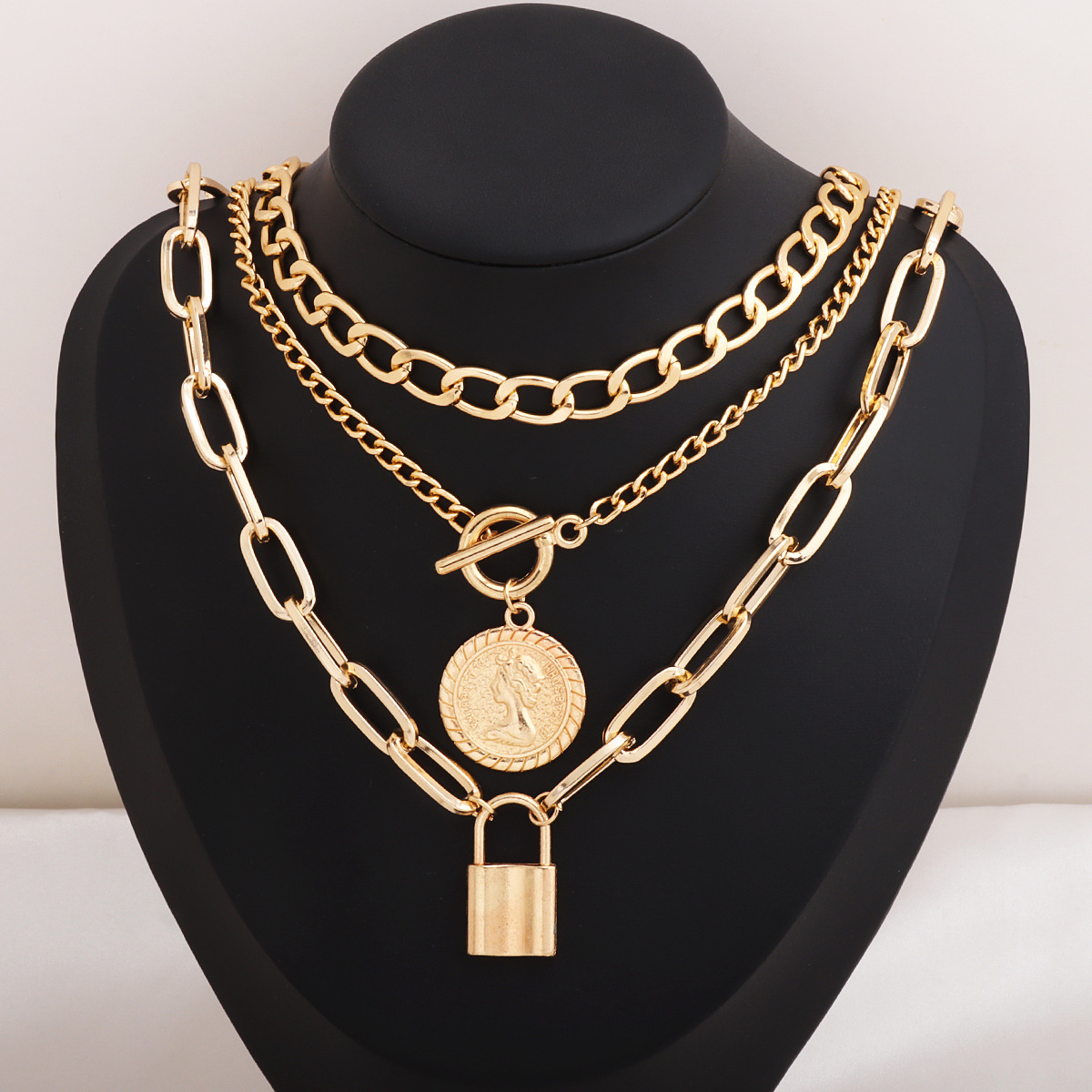 European and American Cross-Border New Fashion Simple Necklace Set Ot Buckle Embossed Disc Lock Pendant Retro Cuban Necklace Jewelry