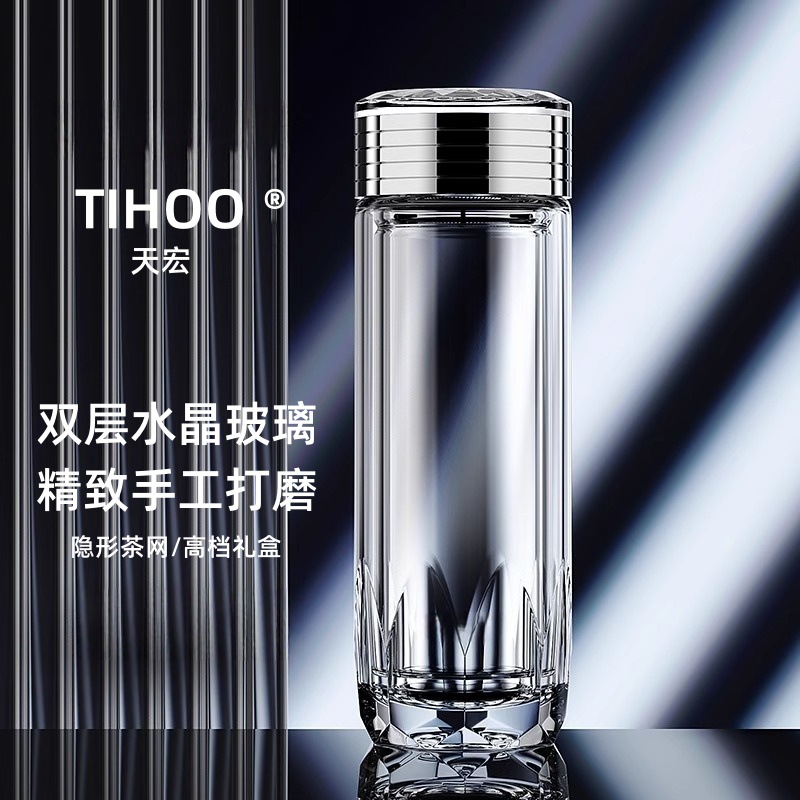Double-Layer Glass Thickeneded Crystal Octagonal Diamond Bottom Tea Cup High-End Men's Business Portable Water Cup Gift Box