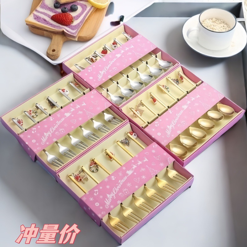 Stainless Steel Creative Christmas Pendant Gold Plated Spoon Fork suit Santa Coffee Dessert Spoon Fruit Fork