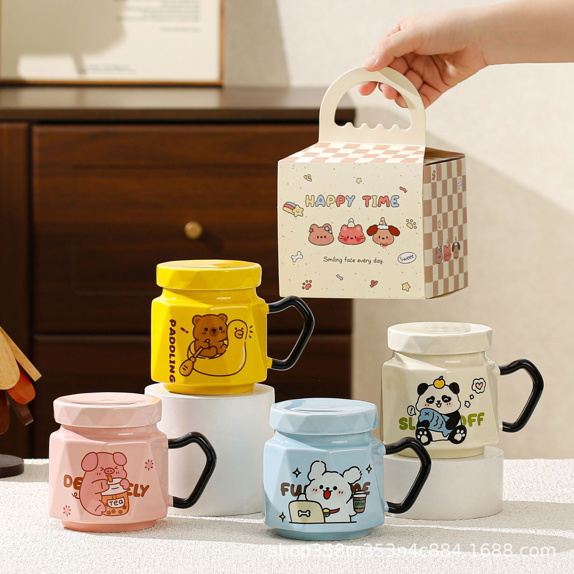 Cute Pet Diamond Contrasting Color Cup, High-Looking Ceramic Mug with Lid, Office Coffee Birthday Gift