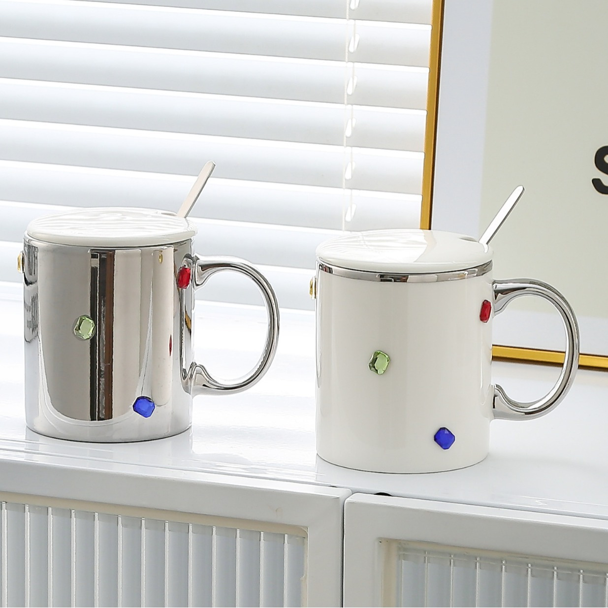 Electroplated Gemstone Mug, High-Looking Creative Ceramic Cup with Lid and Spoon, Household Couple Water Cup, Breakfast Milk Cup
