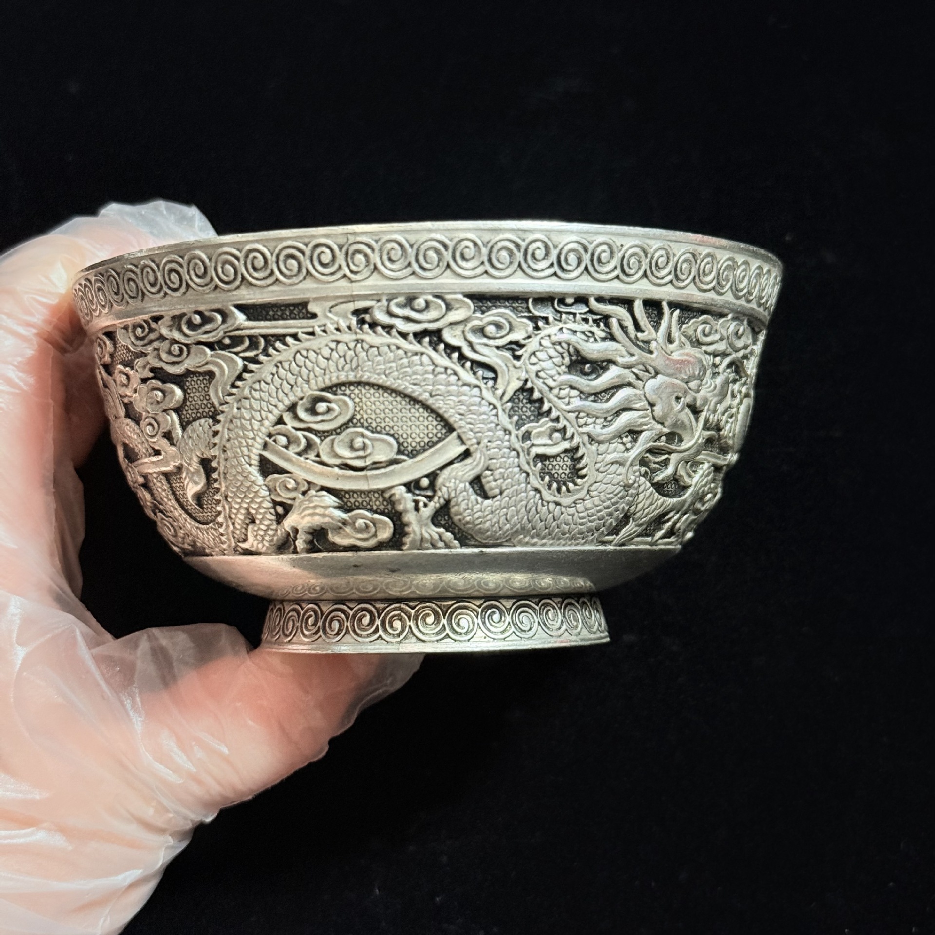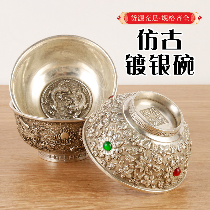 Antique-Style Qing Dynasty乾隆 Era Objects, Fortune and Longevity Bowls, Silver-Plated Embossed Copper Bowls, Home Decor, Handicrafts, Antique Collection
