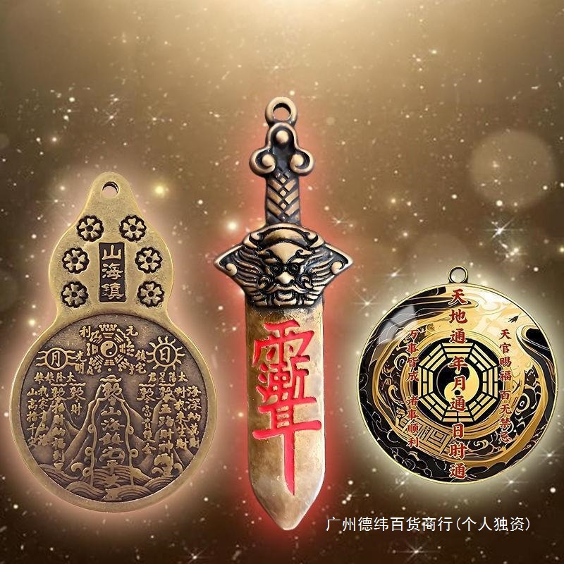 Brass Shanhai Town Bronze Medal Seven-Star Sword Bagua Disc Portable Pendant Set of 3 Chinese Buddhist Statues