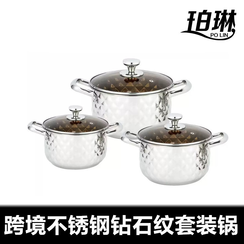 Cross-Border Supply 3-Piece Thickeneded Pot Set Stainless Steel Cookware Diamond Pot with Lid Soup Pot 4-Piece Soup Pot Set