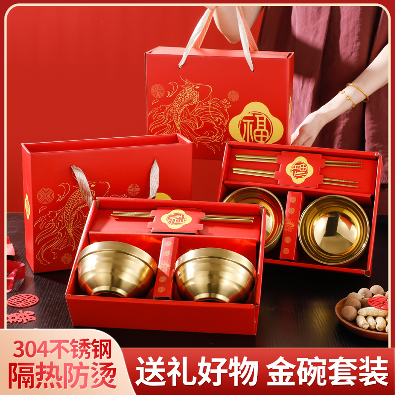 304 Gold Bowl Set Gift Box Stainless Steel Double-Layer Bowl Gold Chopsticks Tableware Bank Insurance Jewelry Gift Holiday