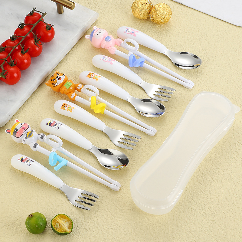 Cartoon children's training chopsticks 304 stainless steel fork spoon with ring cover learning chopsticks baby complementary food tableware suit