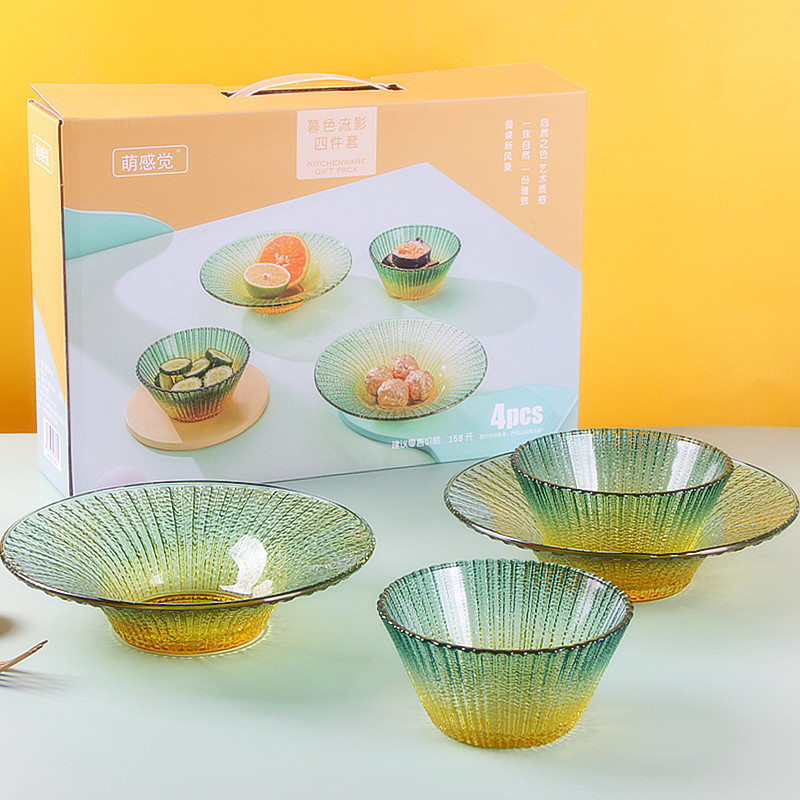 Gradient Glass Bowl and Plate Four-Piece Set for Home Use, Fruit Salad Bowl Set, Jewelry Bank Festival Gift Set