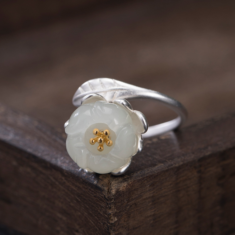 Su 18 s925 silver classical Chinese style Hetian jade bowl flower ring female cross-border beautiful lotus flower ring live mouth