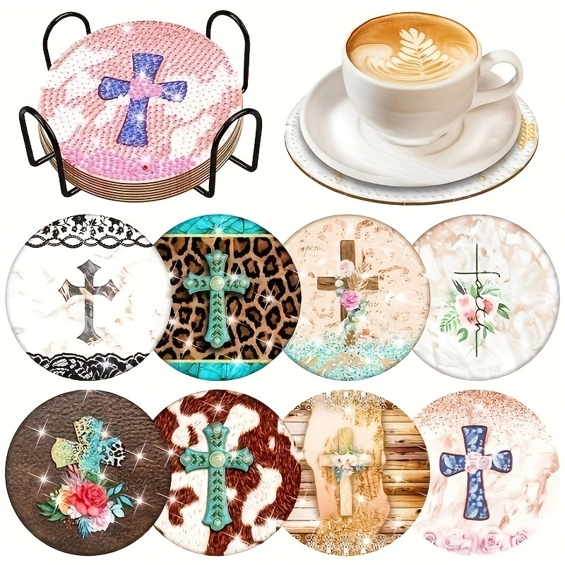 New DIY Handmade Diamond Painting, Bright Diamond Full Diamond Living Room Bedroom Tea Coaster Ornaments 8-Piece Set, Cross Style
