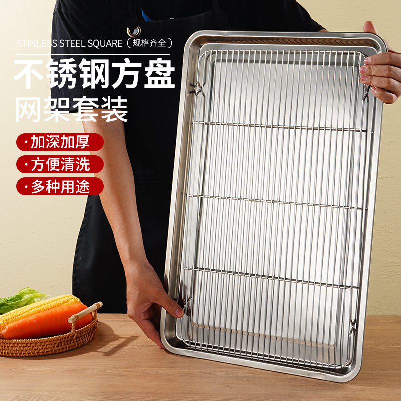 304 Stainless Steel Square Plate with Mesh Tray Commercial Drain Plate Drain Oil Control Baking Cooked Food Barbecue Plate Display Plate