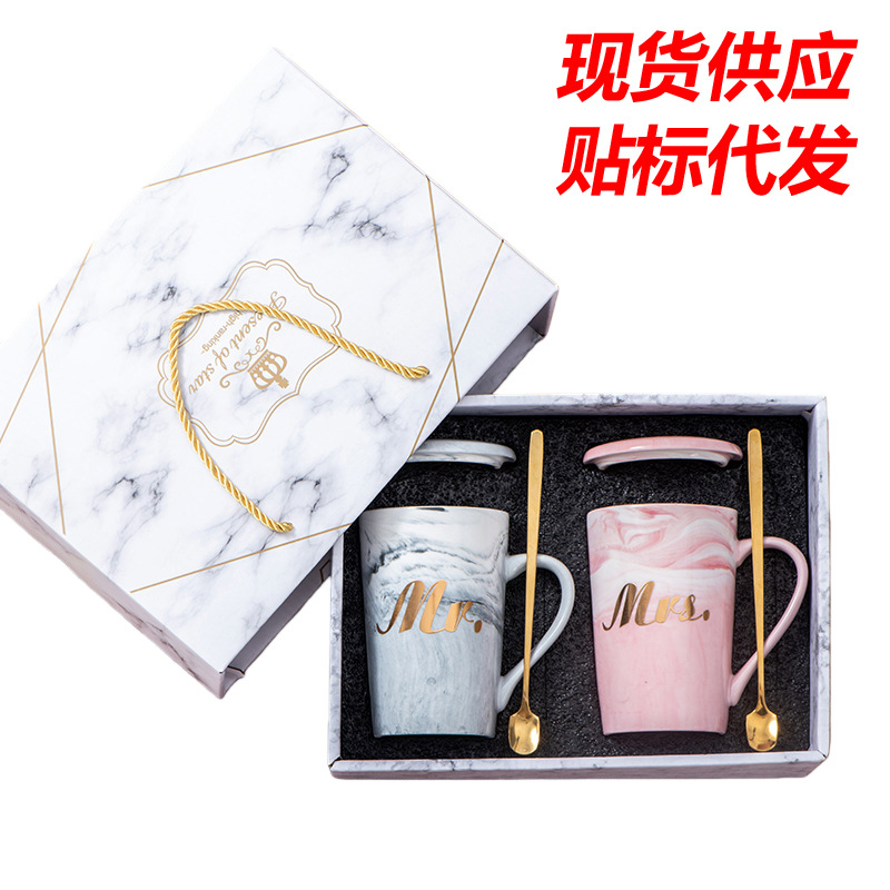 Cross-Border Dropshipping Ceramic Cup Couple Pair Cup with Lid Spoon Mug Chinese Valentine's Day Souvenir Wedding Jewelry Gift Box