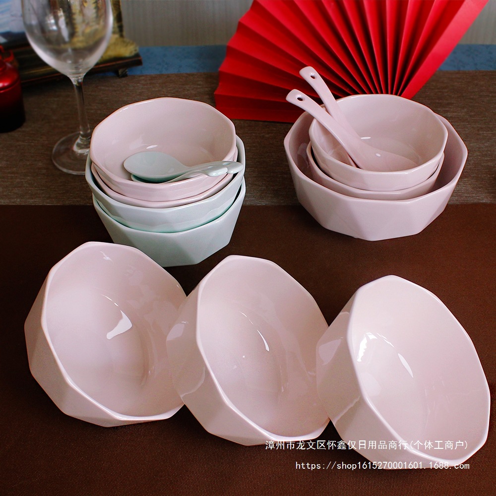 Soup Bowl, Household Rice Bowl, High-Looking Bowl and Plate Set, Ceramic Bowl, Diamond Bowl, Princess Style Pink Cute Small Bowl
