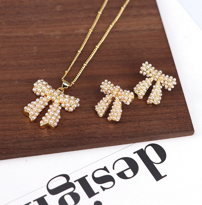 European and American New Elegant Exquisite Sweet Elegant Pearl Bow Earrings Pendant Necklace suit Jewelry
