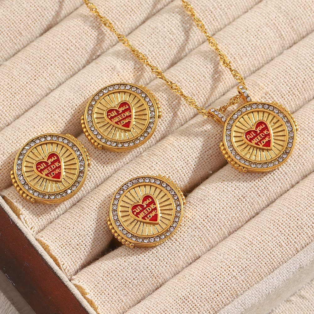 European and American Cross-Border Retro Versatile Stainless Steel Plated 18K Gold Zircon Red Heart Disc Earrings Necklace Ring for Women