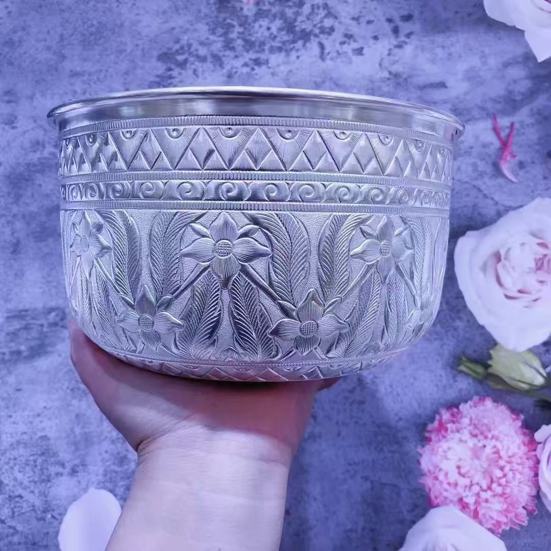 Sterling Silver 999 Silver Bowl Foot Silver Bowl Household Container High-end Handmade Snowflake Silver Fruit Pot Rice Pot Edible Cooked Silver