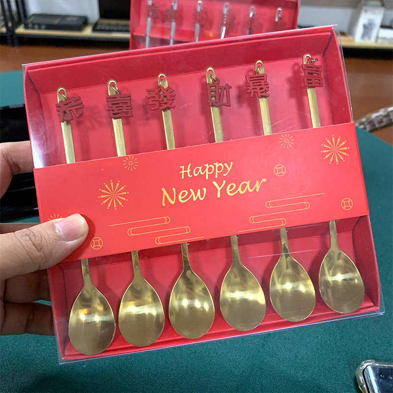 Stainless Steel Creative Cute Pendant Pendant Style Table Spoon New Year Theme Spoon Eating and Drinking Spoon Gift Box Set