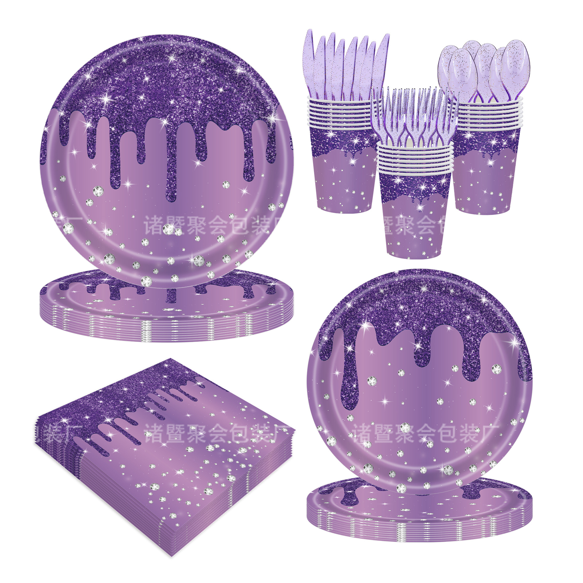 96Pcs Diamond Gilt Purple Birthday Party Tableware Disposable Round Paper Plate Paper Cup Paper Towel Fork Set Wedding