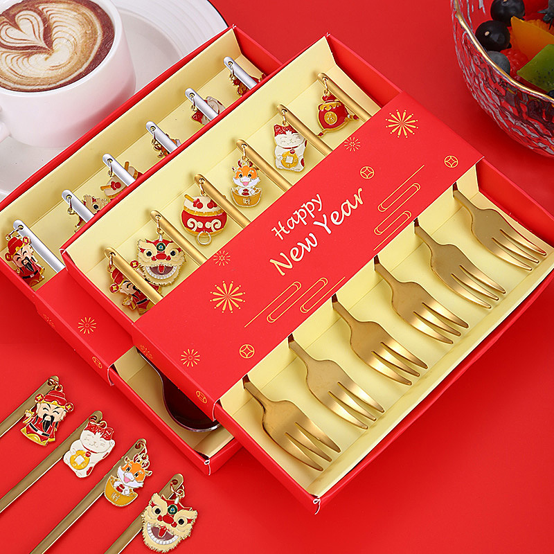 Year of the Dragon Creative Pendant Stainless Steel Tableware Festive Cartoon Pattern Coffee Spoon Pendant Holiday Gift Fork and Spoon Set