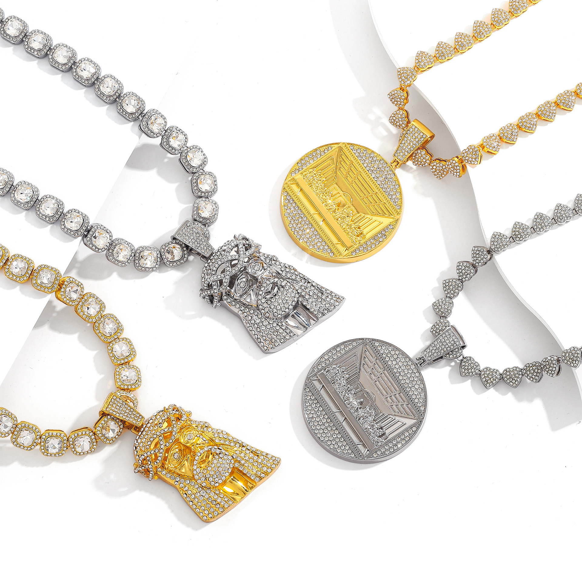 Cross-Border New European and American Cross-Border Hip-Hop Head Necklace Large Disc Dinner Pendant Alloy Full Diamond Cuban Chain Wholesale