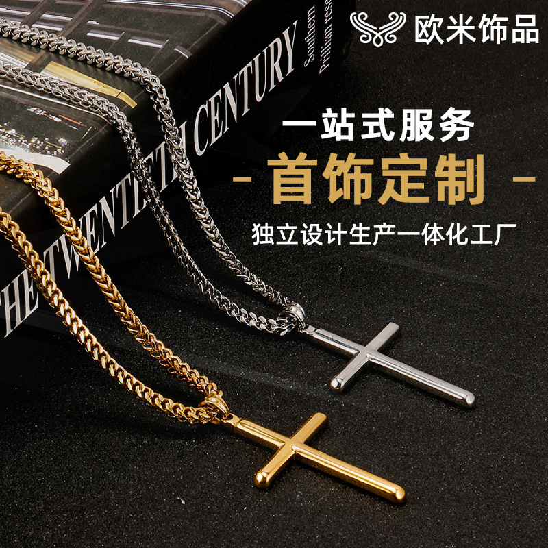 European and American Cross-Border Titanium Steel Glossy Cross Pendant Necklace High-End Men's Front and Back Chain Stainless Steel Necklace Wholesale
