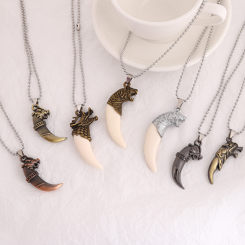 National Trend Retro Men's Domineering Wolf Tooth Necklace Personalized Zodiac Faucet Type Inlaid Pendant Animal Style Sweater Chain