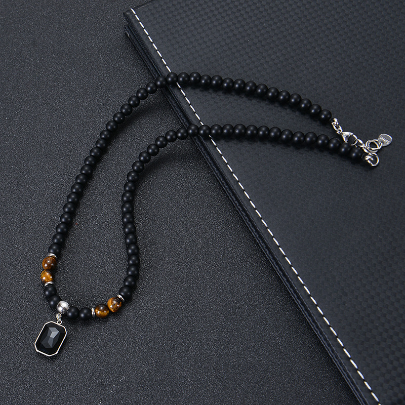 European and American Retro Stainless Steel Black Gemstone Pendant Necklace Men's Frosted Stone Tiger Eye Beaded Hip Hop Necklace Women