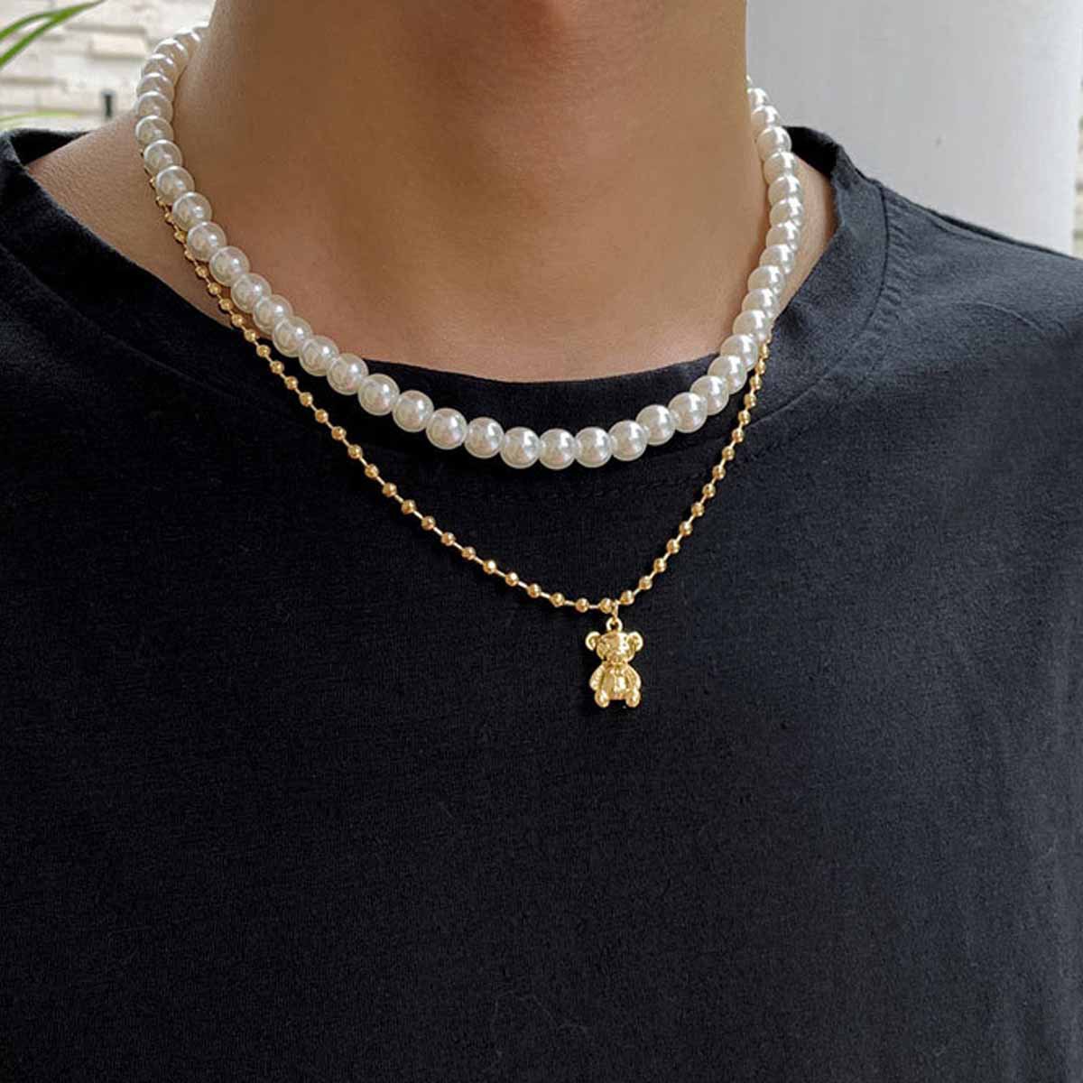 New European and American Cross-border Men's Jewelry Pearl Bear Necklace Niche Design Sense Hip-hop Simple All-match Collarbone