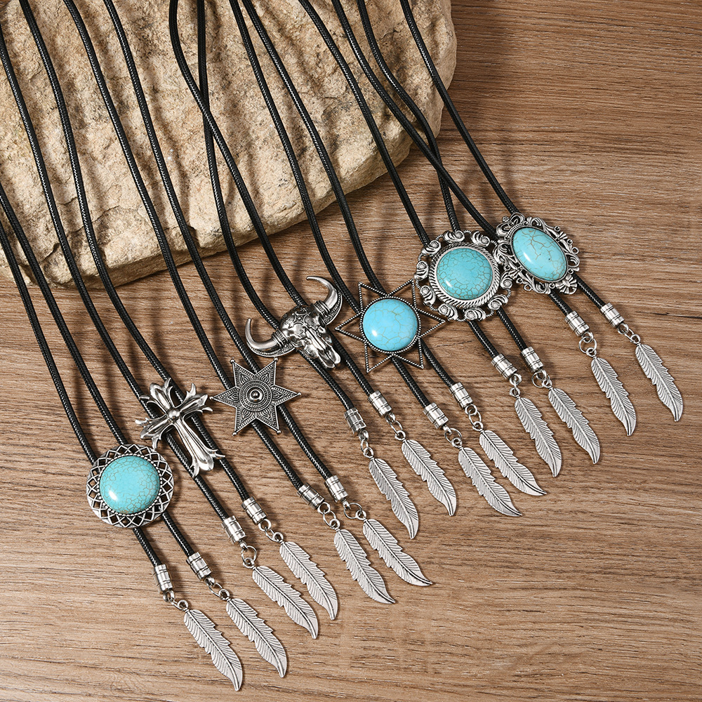Cross-border European and American Western Denim Bolo tie Tie Men's Necklace Turquoise Feather Pendant Wax Cord
