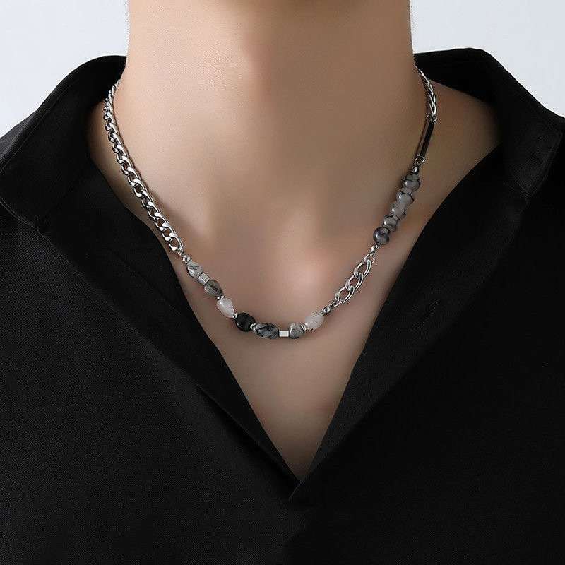 Natural Stone Black and White Crystal Splicing Titanium Steel Necklace Men's Niche Design High-end Stylish Rectangular Letter Necklace