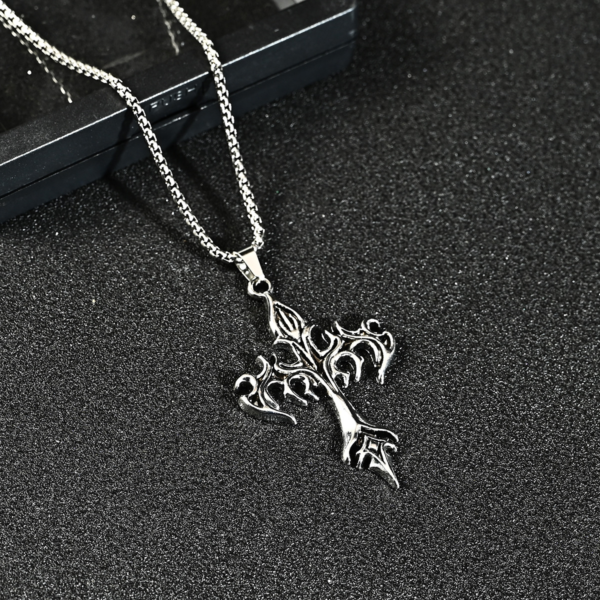 European and American Jewelry Wholesale Retro Trendy Domineering Holy Sword Casting Cross Flame Pendant Titanium Steel Men's and Women's Necklaces