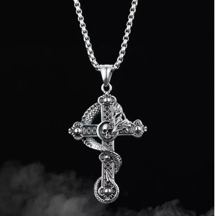 European and American jewelry new retro titanium steel skull cross pendant personality hip-hop panlong men's necklace wholesale