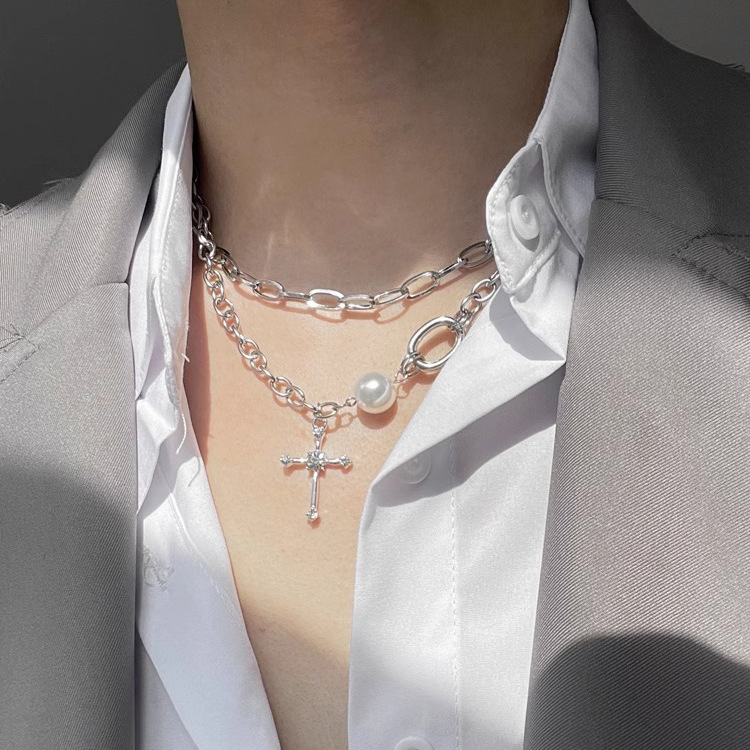 Niche Design Cross Set with Diamonds and Pearls Splicing Double-Layer Clavicle Chain Men's High-End Necklace Trendy Hip-Hop Style European and American