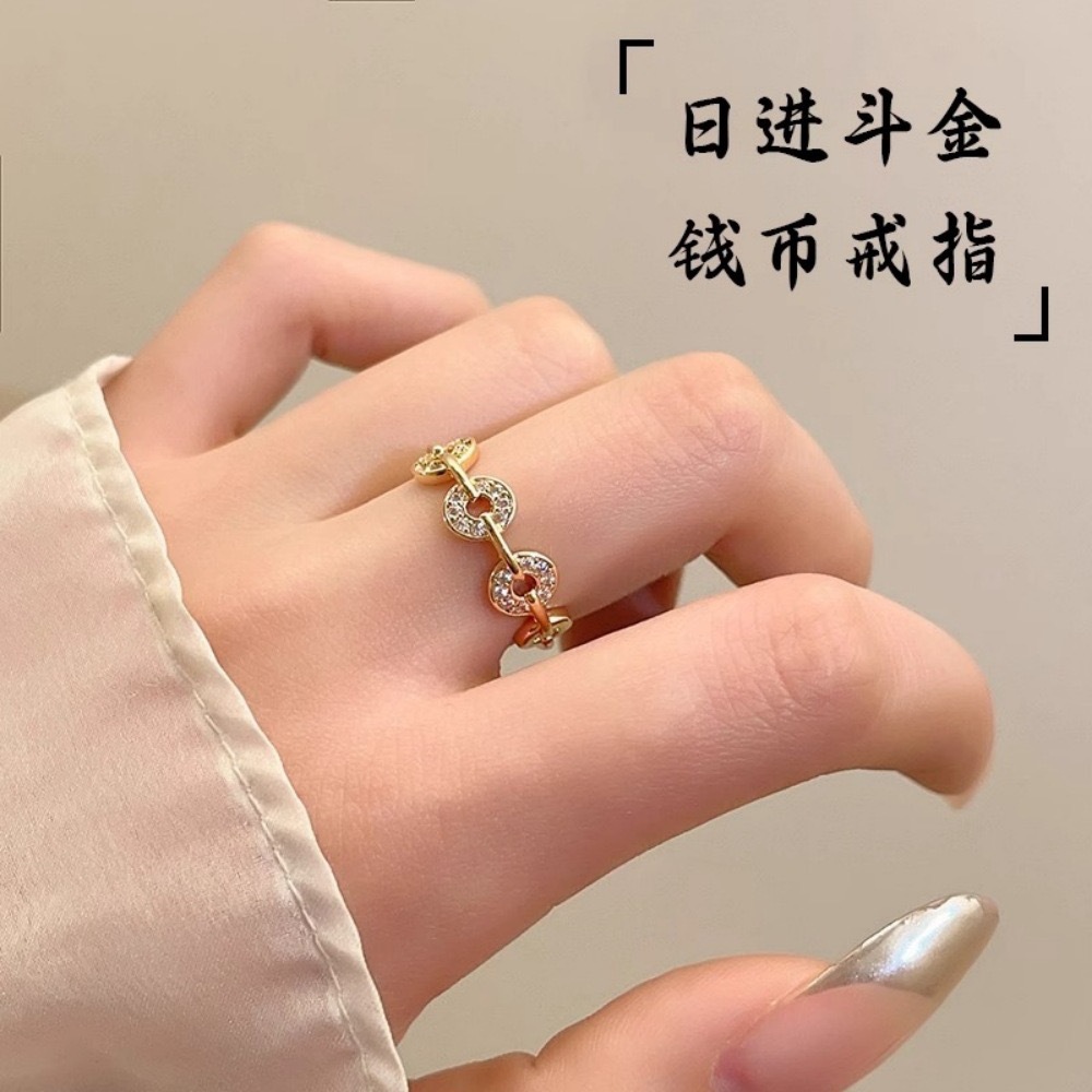 New Chinese Style Wangcai Coin Ring Women's Niche Design High-grade New Double-layer Chain Micro-inlaid Hollow Ring