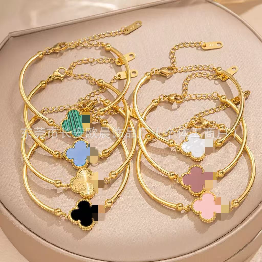 High-End Round Tube Double-Sided Four-Leaf Clover Fashion Bracelet for Women, Versatile Internet Celebrity Live Broadcast Bracelet, Non-Fading Wholesale