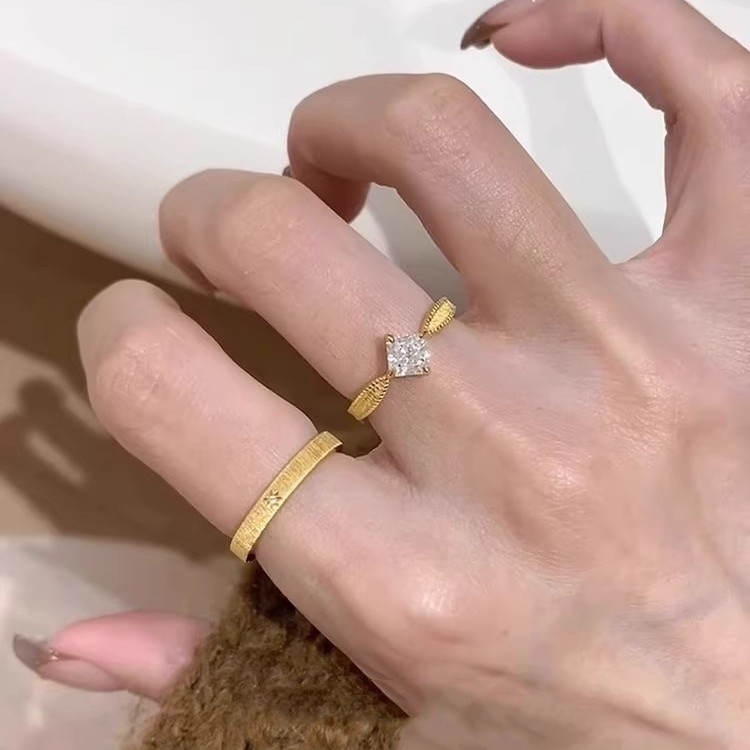 Vintage Gold Brushed Small Square Diamond Starburst Ring for Women, Retro Light Luxury Layered Simple Versatile Moissanite Ring