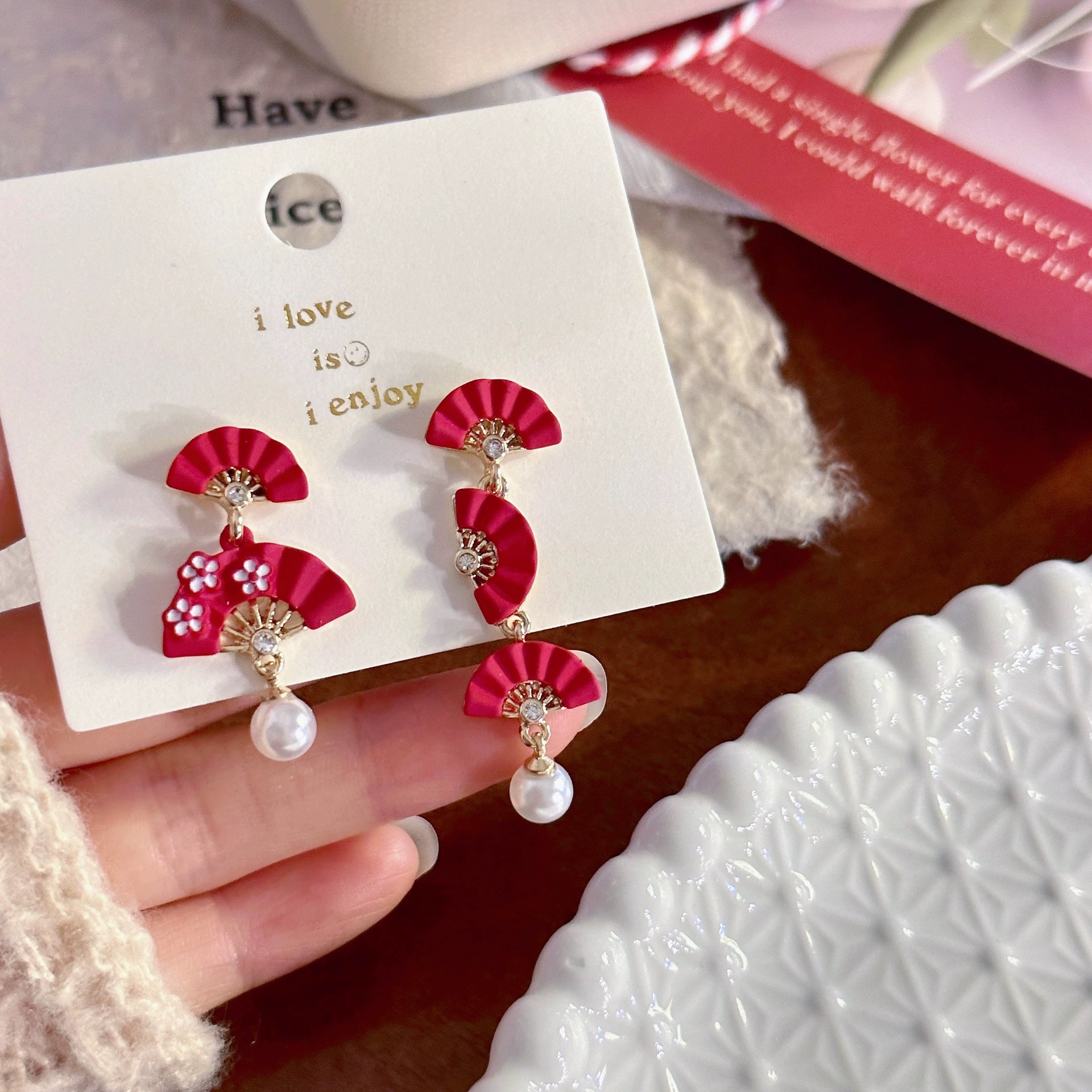 New Year Red Small Earrings for Women, Festive Chinese Style Folding Fan Earrings, Personalized Earrings, High-End Yiwu Accessories