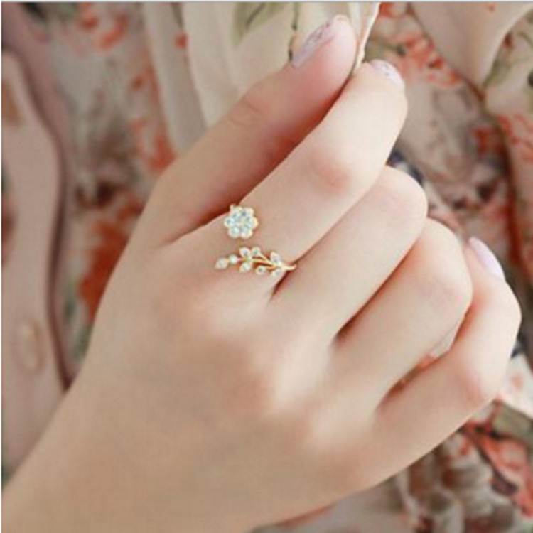 Korean Style Fashionable Diamond-Encrusted Twisted Leaf and Flower Open Ring, Index Finger Ring for Women, Unique Jewelry