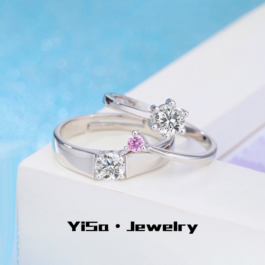Classic Six-claw diamond-embedded zircon pink diamond couple ring European and American light luxury niche high-end fashion Open ring for women