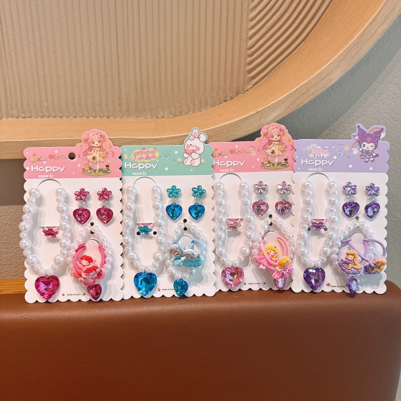 Children's Pearl Necklace 7-Piece Set Princess Beaded Heart Gemstone Pendant Jewelry Set Baby Girl Versatile Accessories