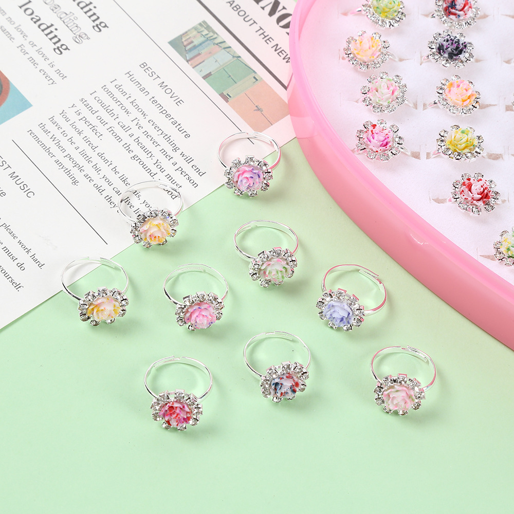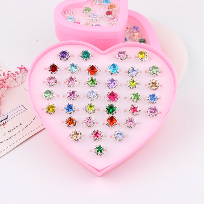 Children's Ring Set Rhinestone Girls Exquisite Ring Buckle Color Diamond Cute Baby Adjustable Love Box 36 Pack
